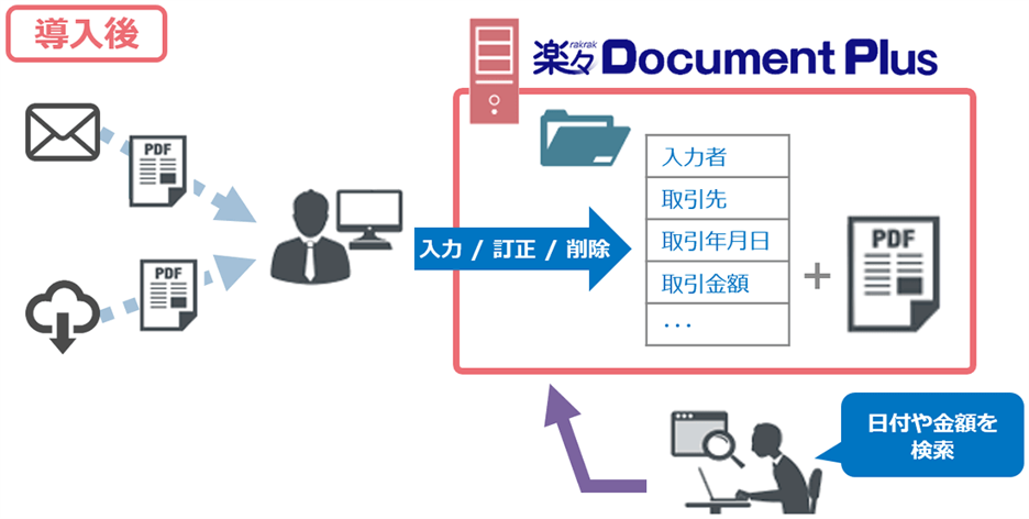 楽々Document Plusを導入することで電子帳簿保存法のうち、 国税関係書類の「スキャナ保存」と「電子取引」に必要な機能を網羅しており、効率よく運用できます。